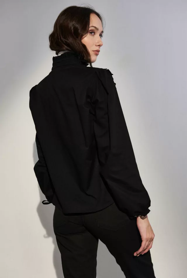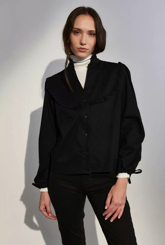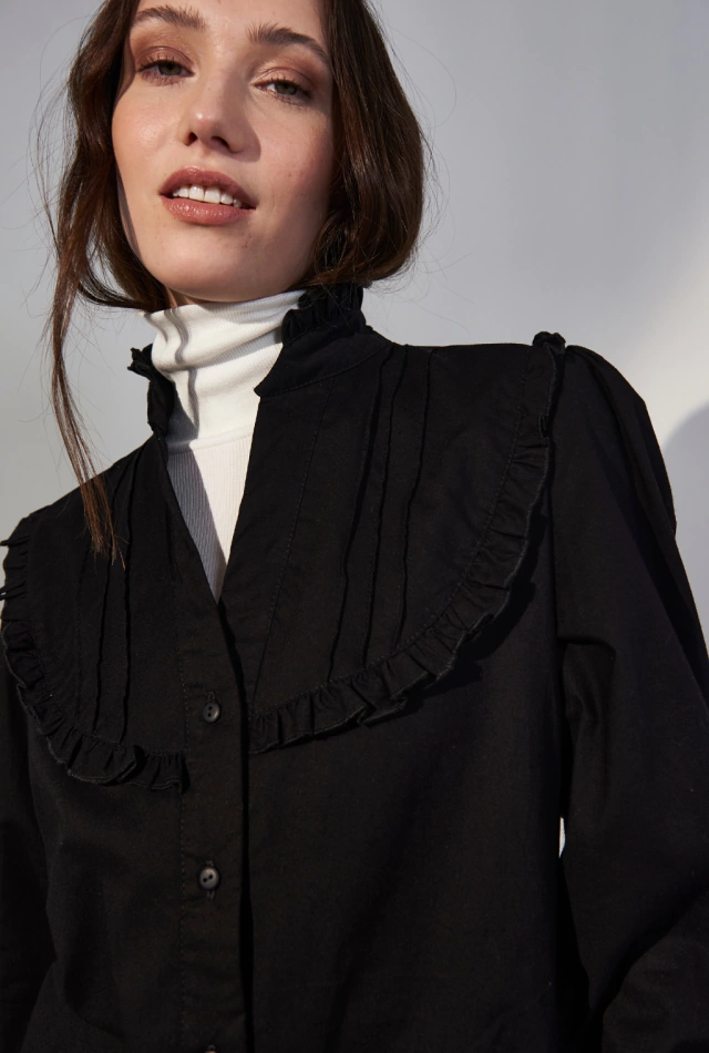DESCRIPCIÓN: Camisa con cuello mao y escote en “V” , cerramiento delantero mediante botones a tono. Posee detalles de volados en cuello y delantero en forma de semicírculo que contiene tres pequeñas alforzas de cada lado. La manga tiene pinzas en la copa y se puede usar de dos maneras , recta o fruncida con el recurso del extremo de la misma, generando una manga estilo globo.