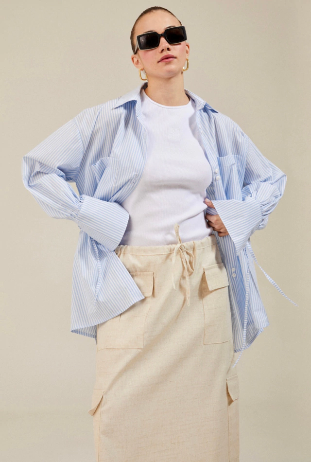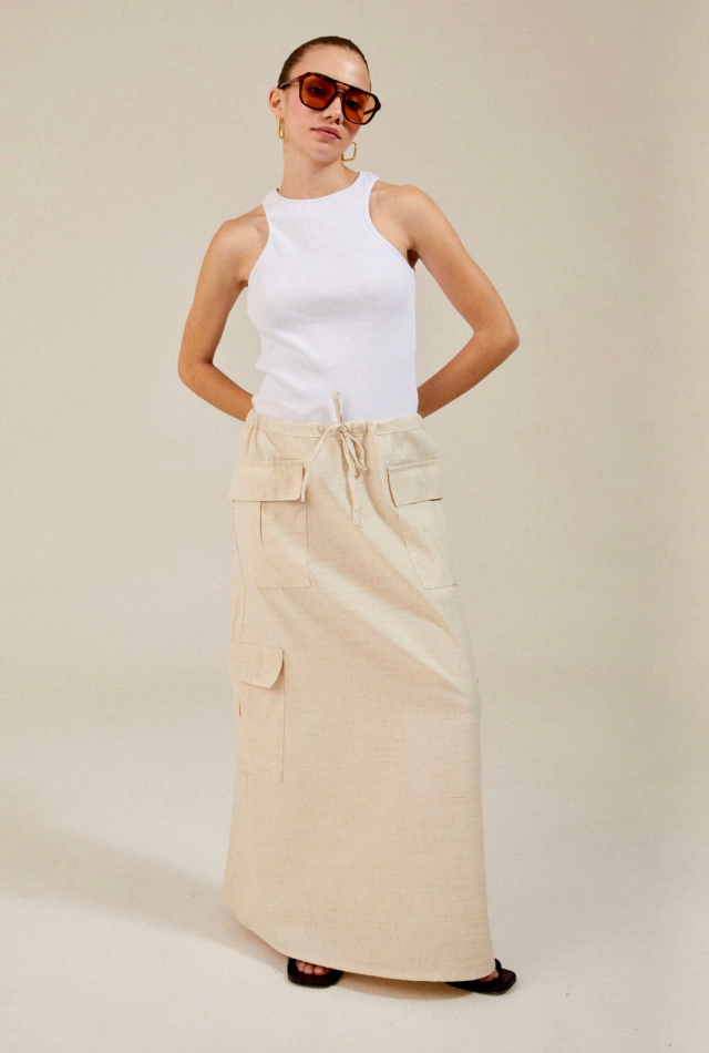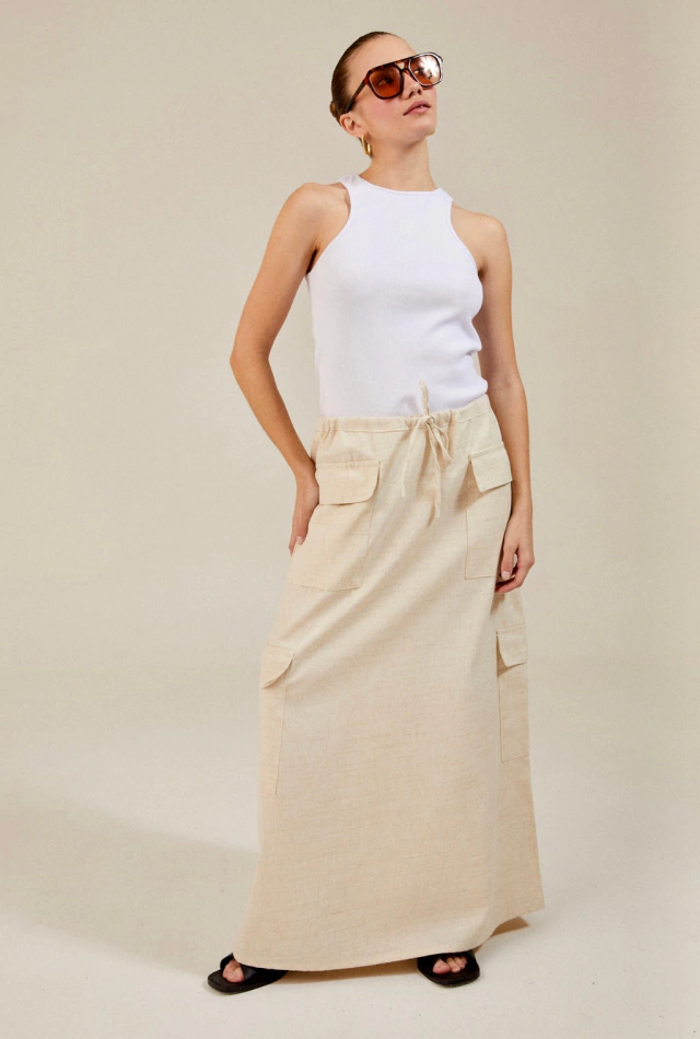 DESCRIPCIÓN: Falda larga con corte recto confeccionada en lino mezcla. Es una falda al estilo cargo, multibolsillos con tapa en los laterales. La cintura es amplia y posee cordón, cuyo fin es permitirte usar la falda con el tiro que desees.