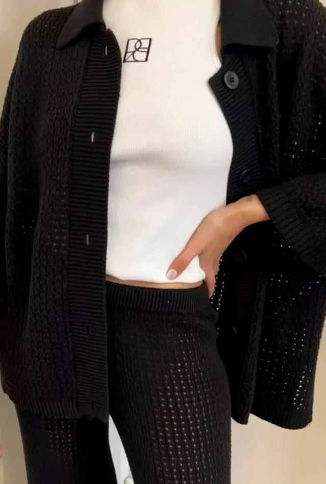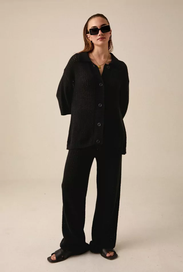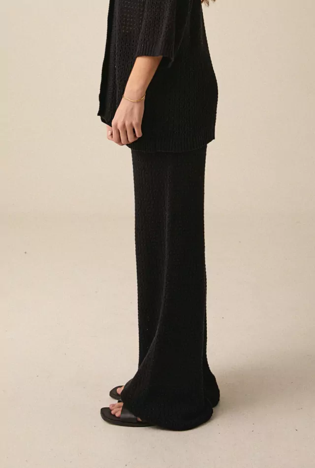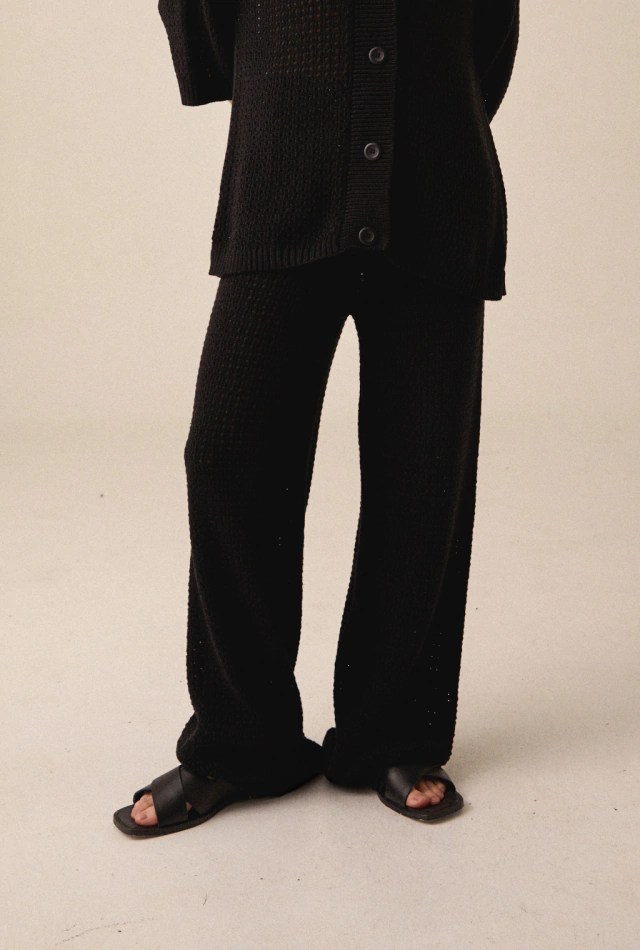 DESCRIPCIÓN: Pantalón tejido recto con pequeños calados , que evitan que la prenda trasluzca manteniendo la comodidad y siendo fresca. La cintura tiene elástico y tiras para fruncir y atar como prefieras.