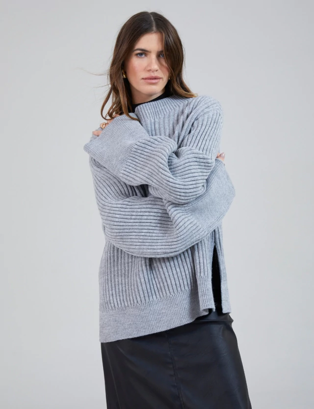 El sweater GOZO esta tejido en acrilico, es un tejido grueso y pesado. Es de corte recto, silueta oversize y hombros caídos. Su particularidad son sus mangas que finalizan en un puño de doble ancho. Tejido con punto acanalado especialmente desarrollado para esta prenda, con escote redondo tipo bote y tajos laterales. Tiene variaciones de puntos en las terminaciones de cuello , mangas y ruedo.