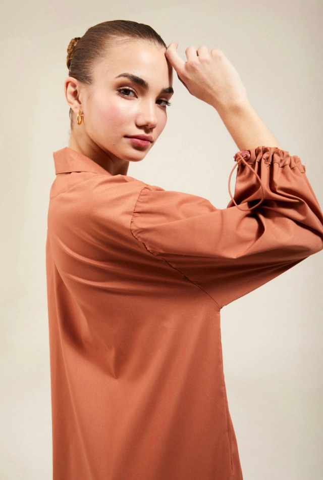 DESCRIPCIÓN: Vestido oversize , con acceso frontal mediante cartera de botones. Tiene cuello de solapa y bolsillos laterales. Las mangas de hombros caídos poseen elásticos y tancas (teñidos a tono) en el puño para poder fruncir. Lo más lindo de este vestido es el detalle de recorte con fruncido a mano en todo el bajo, que genera una silueta super diferente.