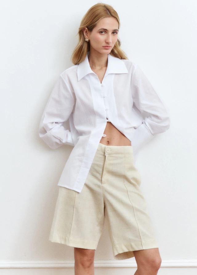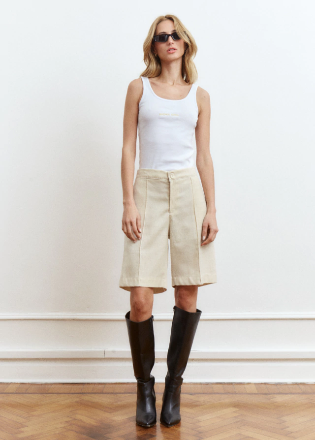 La bermuda VIVEZA está confeccionada en lino mezcla jaspeado. De corte sastrero recto , con bolsillos laterales y dos bolsillos ojales atrás. La cintura posee elástico en la espalda para mayor comodidad y adaptabilidad al cuerpo. Los detalles que la identifican es la alforza que recorre todo el largo delantero y el bordado del logo de marca en la parte trasera.