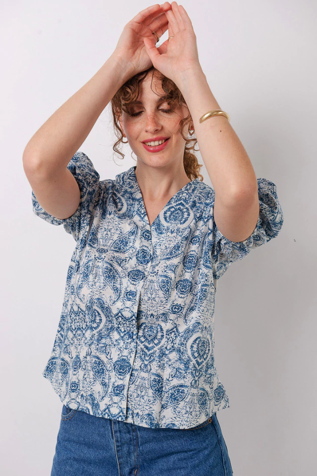 DESCRIPCIÓN: Blusa con acceso frontal mediante cartera de botones y escote en “V”. Posee pinzas en el delantero y espalda que acentúan sutilmente la silueta. Sus mangas globo son las protagonistas.