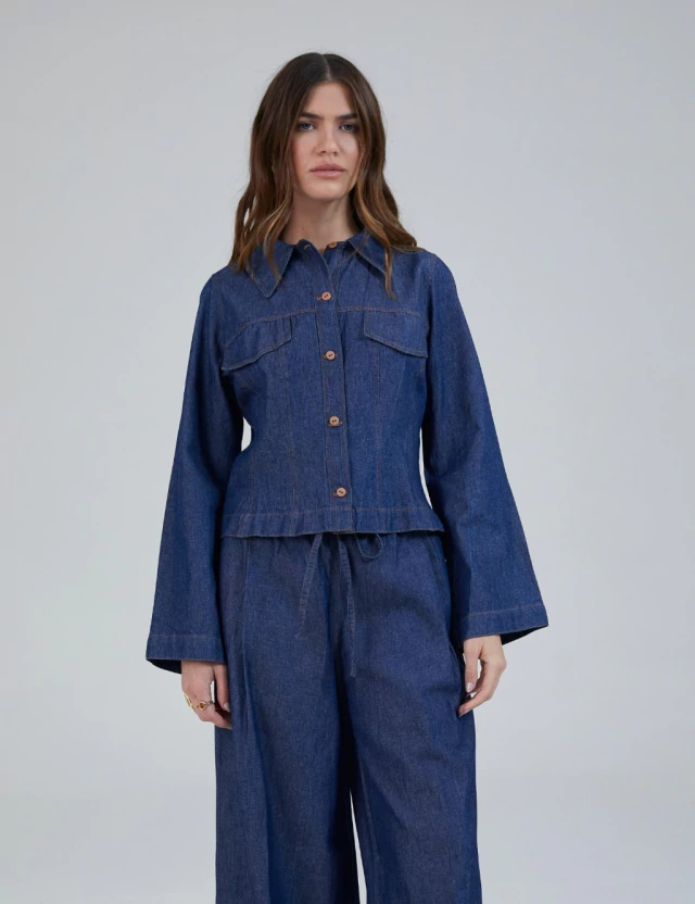 La camisa ACRONICA está confeccionada en denim camisero. De corte entallado con recortes en frente y espalda que lo acentúan. En la parte baja de la espalda los recortes finalizan en tablas. Posee tapas de falsos bolsillos, mangas acampanadas ,acceso frontal mediante botones y costuras a contratono.