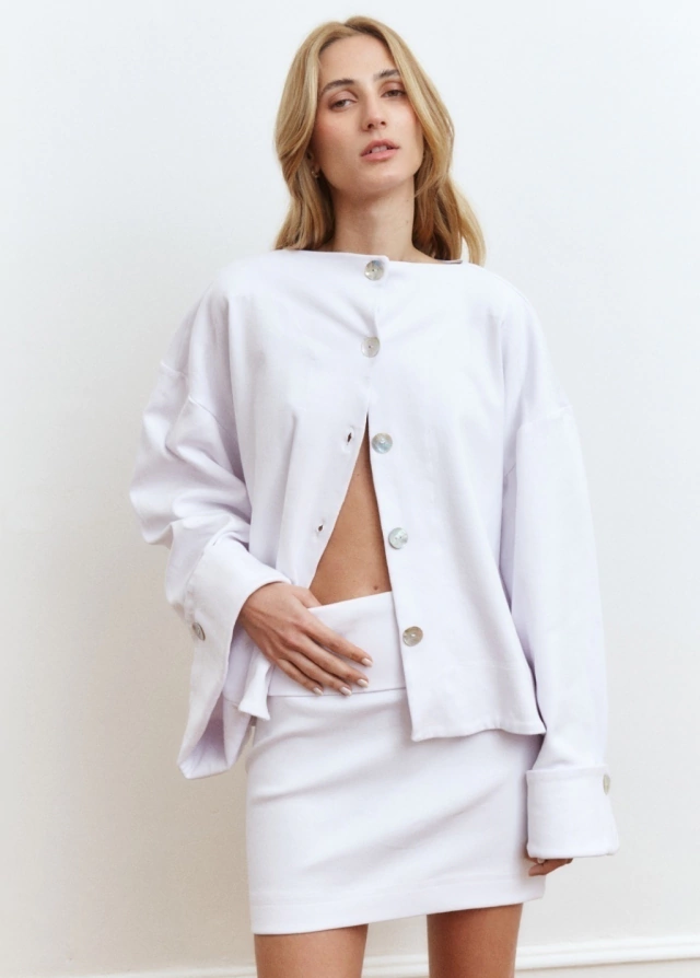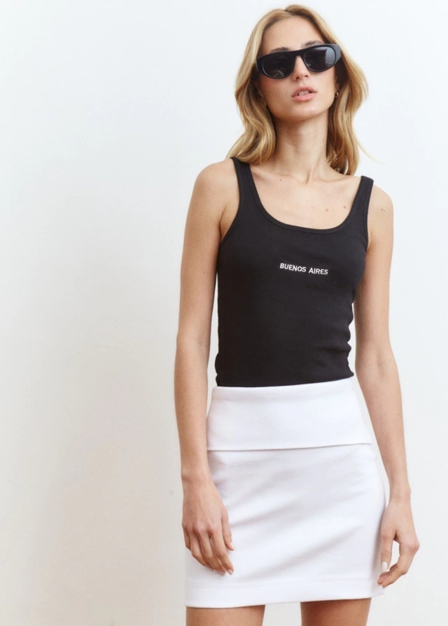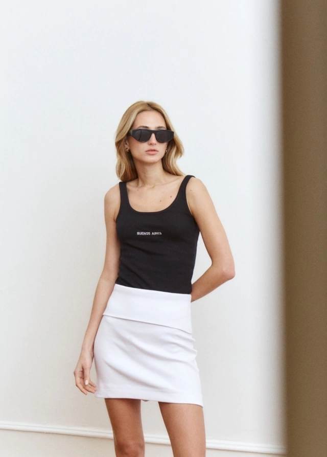 La falda SAGAZ esta confeccionada en algodon de punto. Es una falda corta con la cintura rebatida.