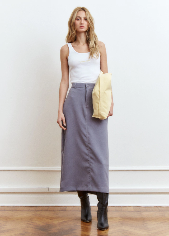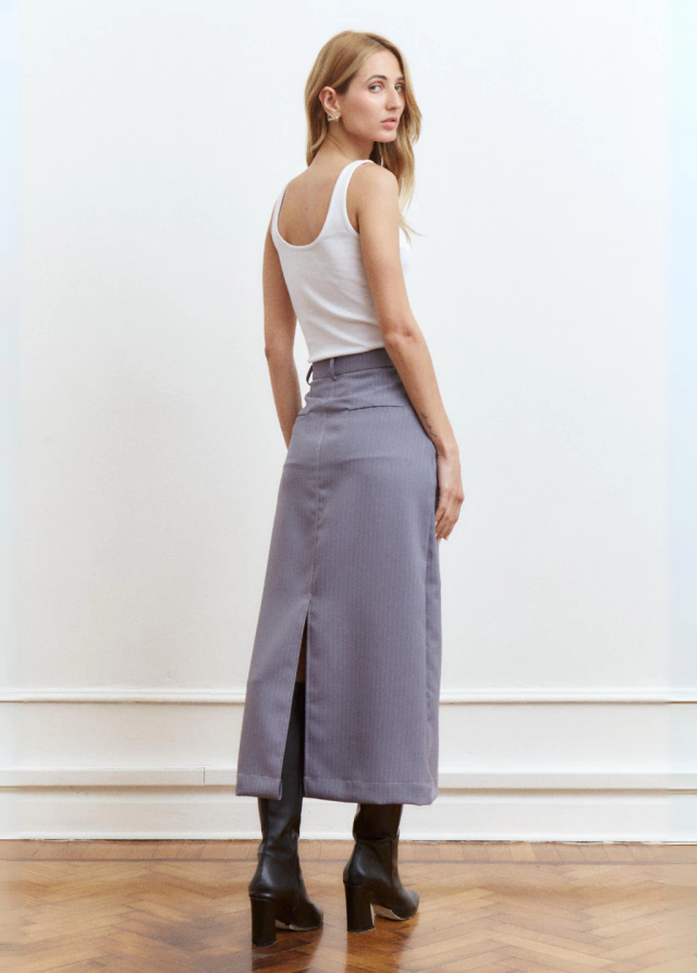 La falda VISIBLE está confeccionada en textil sastrero. Acceso frontal mediante cierre y un botón. Posee dos bolsillos laterales y dos bolsillos ojales en la espalda. Su forma es tipo tubo y tiene un tajo en la parte trasera para más comodidad.