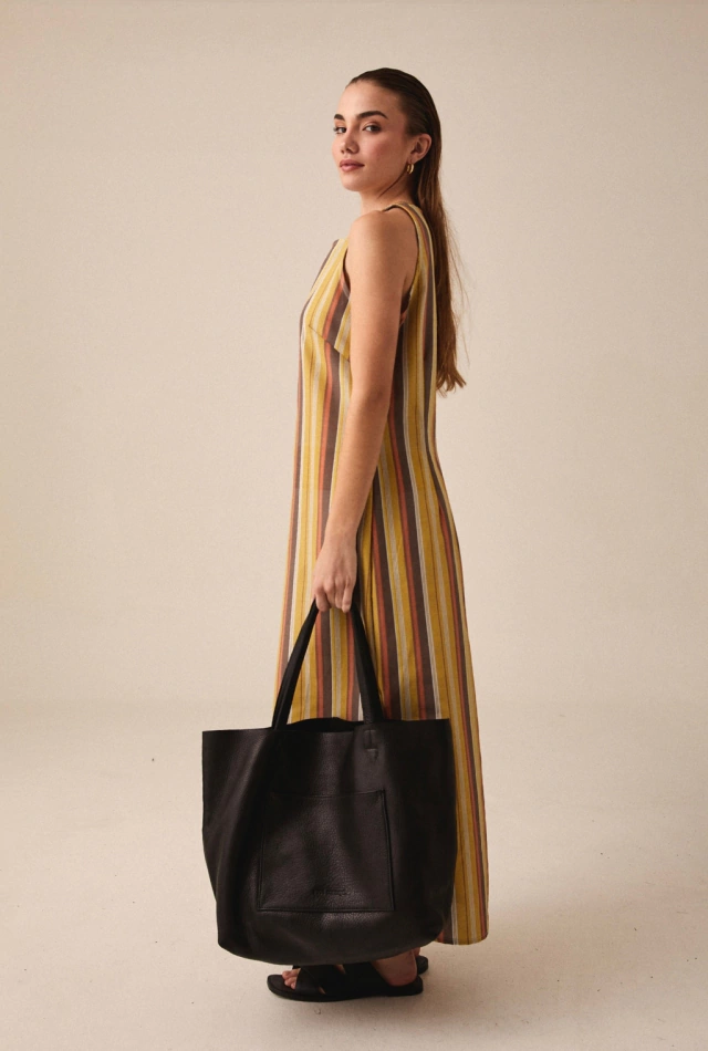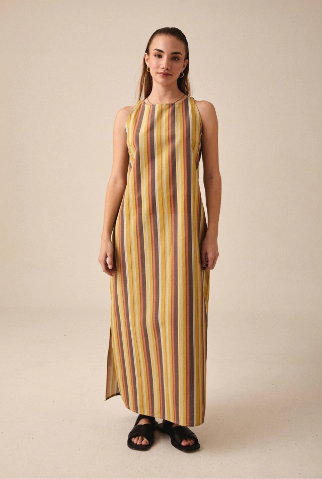 DESCRIPCIÓN: Está confeccionado en lino mezcla con estampa propia. Es un maxi vestido de corte recto con tirantes. Cuello redondo y cerramiento con botón en la espalda. Tiene tajos en los laterales inferiores.