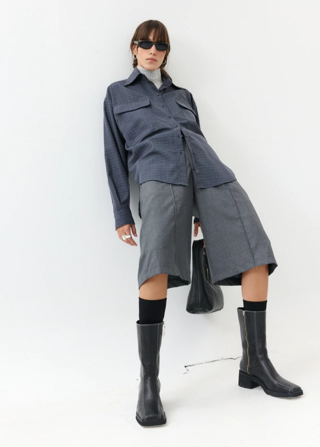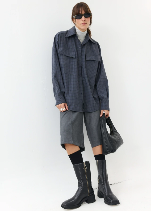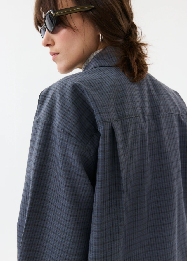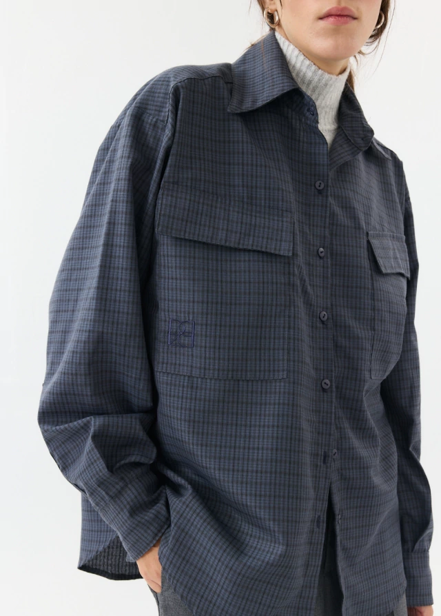 La camisa EMBLEMA está confeccionada en poplin escoces. De corte recto y moldería oversize. Posee dos bolsillos delanteros con tapas en diagonal ( uno tiene el logo de marca bordado ) con acceso frontal mediante botones a tono.
