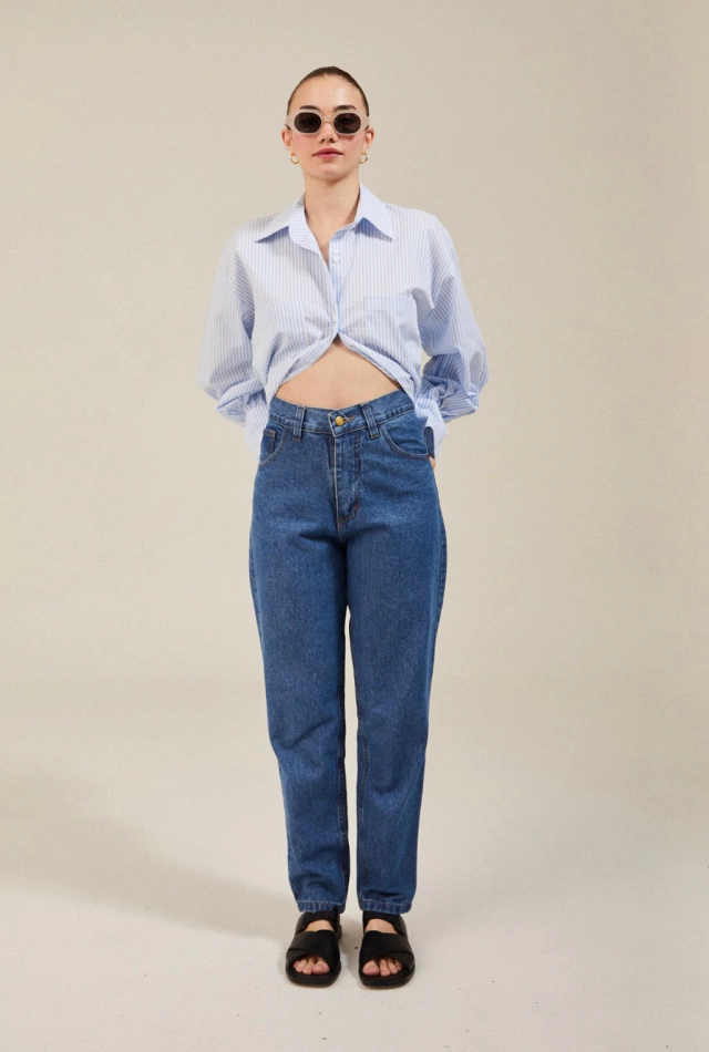 DESCRIPCIÓN: Pantalón mom fit tiro alto ,de corte holgado y pierna semi recta. Posee cuatro bolsillos y si bien la tela es rígida , el proceso de lavado lo hace blando y cómodo, lo que genera que tenga el calce perfecto.