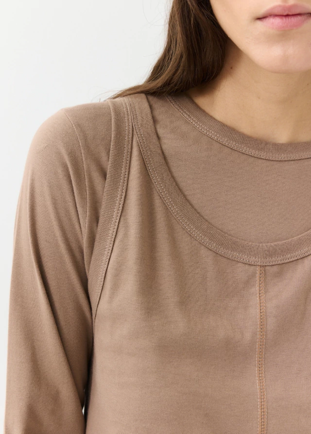 La remera AMBIGUA está confeccionada en jersey de algodón. Son dos remeras en una , por debajo una remera manga larga y encima una musculosa. Confeccionadas perfectamente para que puedan usarse superpuestas o por separado ,siguiendo la tendencia pero siempre a nuestra manera. Tiene detalles de costuras en el centro y una es más larga que la otra para que juntas se note ese detalle.