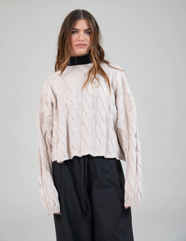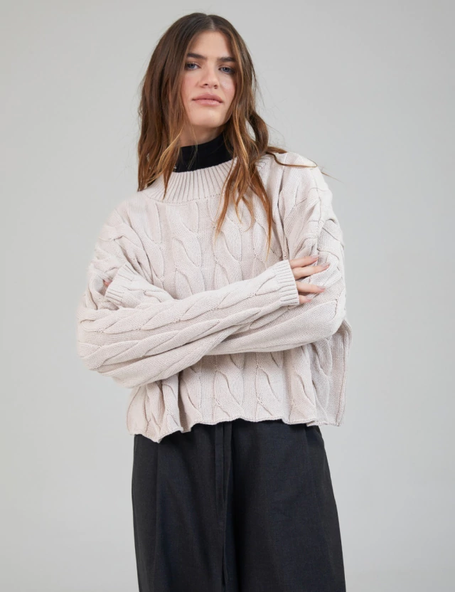 El sweater INTENSO está tejido en algodón de super calidad. Es de corte recto, silueta oversize y hombros caídos. Tejido con motivo de trenzas finas, con escote redondo media polera realizado en punto acanalado. Largo por debajo de la cintura.