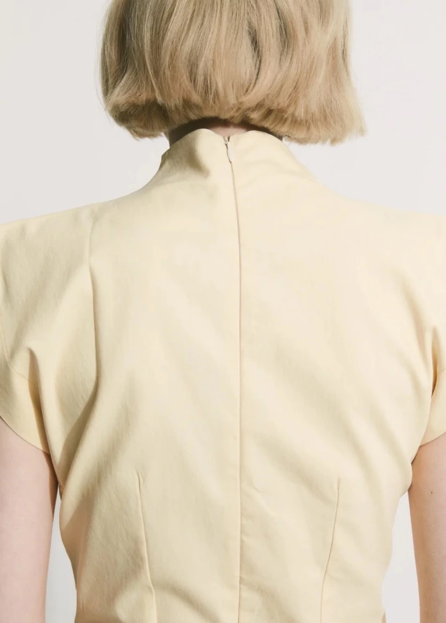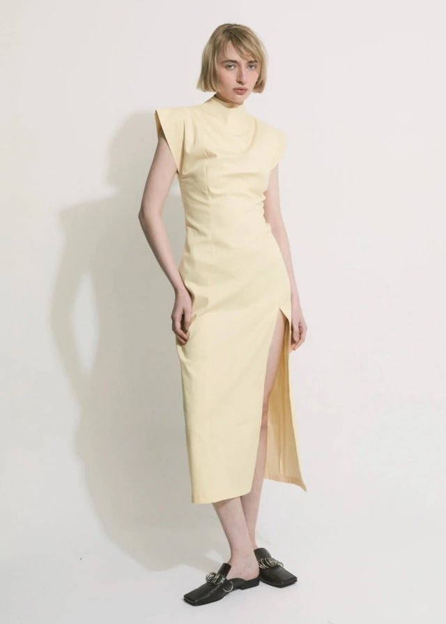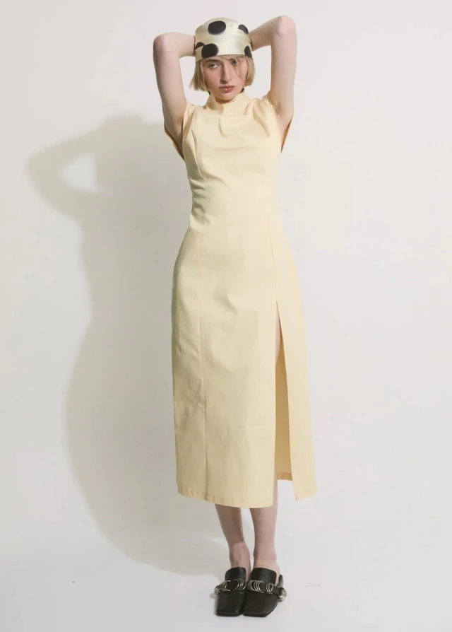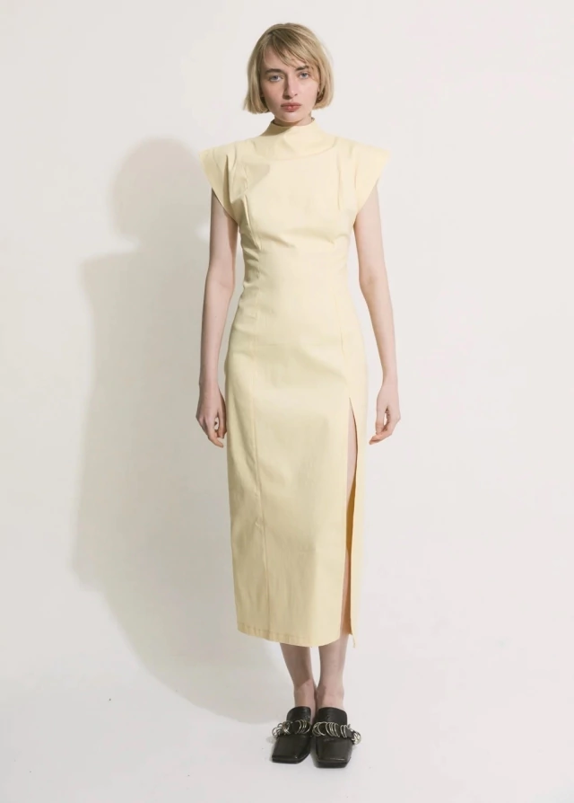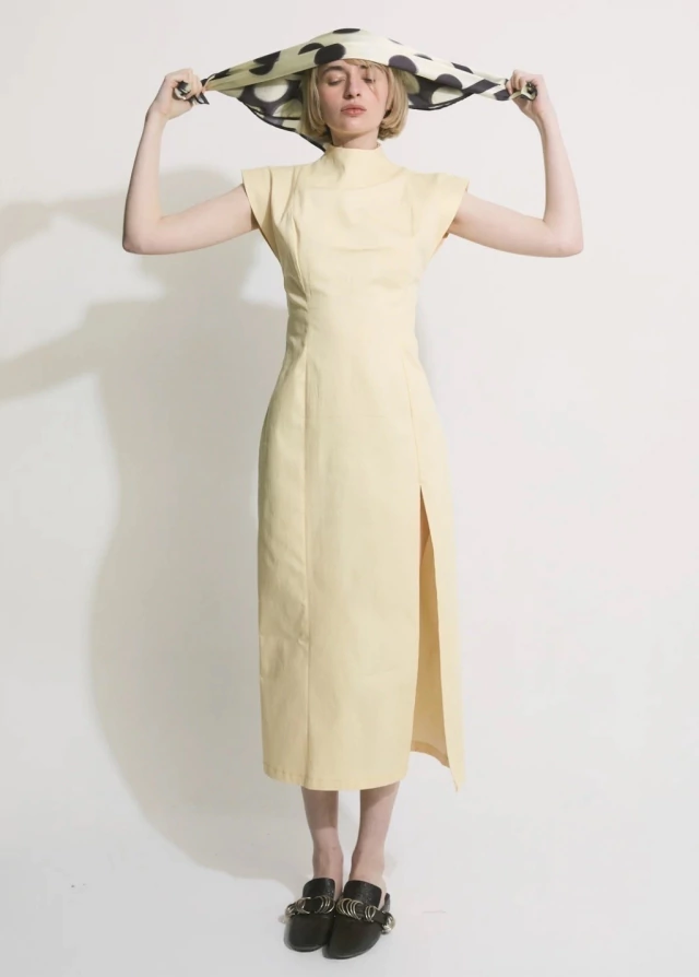 El vestido POSTRE es una prenda que continua la silueta japonesa, confeccionado en gabardina de 5oz elastizada. De silueta más ajustada , con recortes que la realzan. Cuello semi alto , con mangas que sobresalen generando estructura. Además tiene un tajo delantero y un cierre invisible que recorre toda la espalda. Es una prenda adaptable que trasciende lo convencional y destaca por su versatilidad de usos.