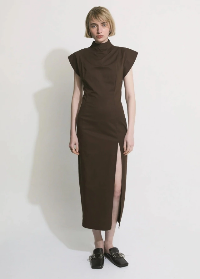 El vestido POSTRE es una prenda que continua la silueta japonesa, confeccionado en gabardina de 5oz elastizada. De silueta más ajustada , con recortes que la realzan. Cuello semi alto , con mangas que sobresalen generando estructura. Además tiene un tajo delantero y un cierre invisible que recorre toda la espalda. Es una prenda adaptable que trasciende lo convencional y destaca por su versatilidad de usos.